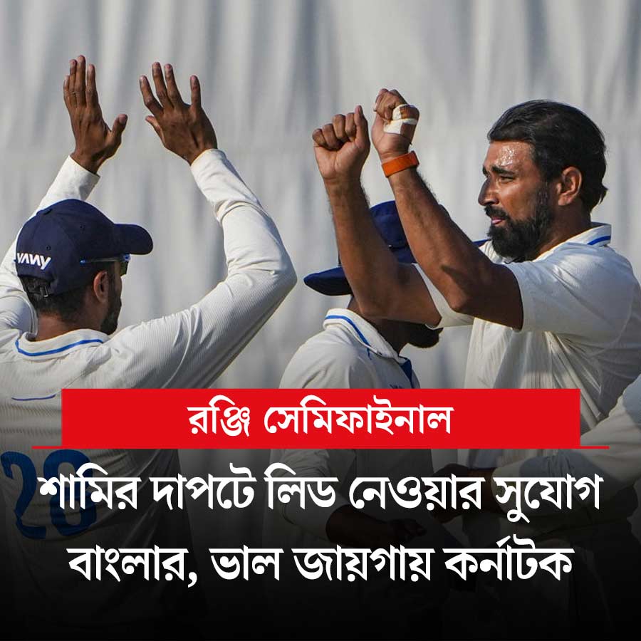 প্রথম ইনিংসে ৩২৮ রানে অল আউট হয়ে গিয়েছে বাংলা। মহম্মদ শামির দাপটে জম্মু-কাশ্মীর শুরুতে ধাক্কা খেলেও পারশ ডোগরা-আব্দুল সামাদ জুটি তাদের ম্যাচে ফিরিয়েছে। দ্বিতীয় দিনের শেষে বাংলা এগিয়ে ১৩০ রানে। জম্মু-কাশ্মীরের হাতে রয়েছে ৫ উইকেট। আজ কি বাংলাকে লিড দিতে পারবেন শামিরা? খেলা শুরু সকাল ৯টায়। অপর সেমিফাইনালে রানের পাহাড়ে কর্নাটক। লোকেশ রাহুলের শতরান ও দেবদত্ত পড়িক্কলের দ্বিশতরানের পর আর স্মরণও শতরান করেছেন। এখনও কর্নাটককে অল আউট করতে পারেনি উত্তরাখণ্ড। প্রথম ইনিংসেই ফাইনালের পথ সুগম করে ফেলতে চাইছে কর্নাটক। এই ম্যাচ শুরু সকাল সাড়ে ৯টা থেকে। সরাসরি দেখা যাবে জিয়োহটস্টার অ্যাপে।