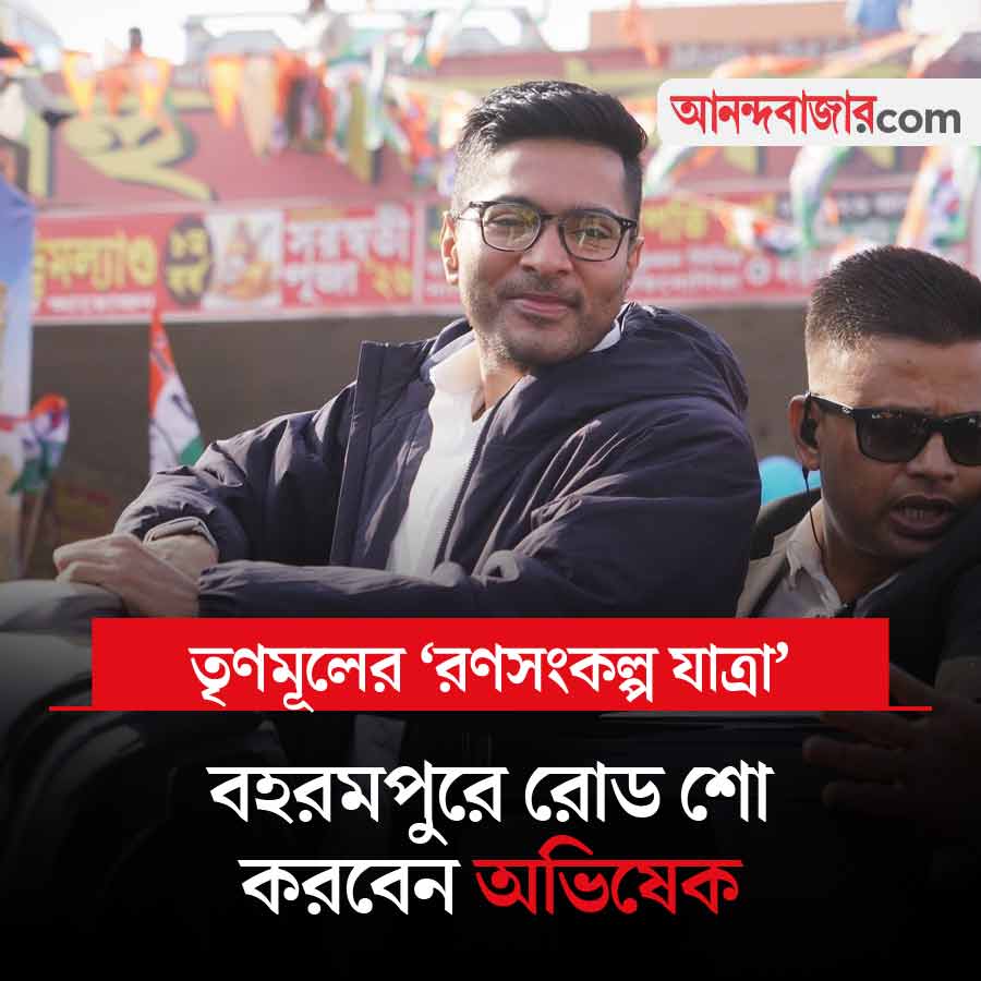 চলতি জেলাসফরে আজ অভিষেক বন্দ্যোপাধ্যায়ের কর্মসূচি রয়েছে মুর্শিদাবাদের বহরমপুরে। বেশির ভাগ জেলায় জনসভা করলেও বহরমপুরে অভিষেকের রোড শো করার কথা। এর আগে উত্তর দিনাজপুরের ইটাহারে রোড শো করেছিলেন তিনি। অভিষেকের কর্মসূচির খবরে নজর থাকবে আজ।