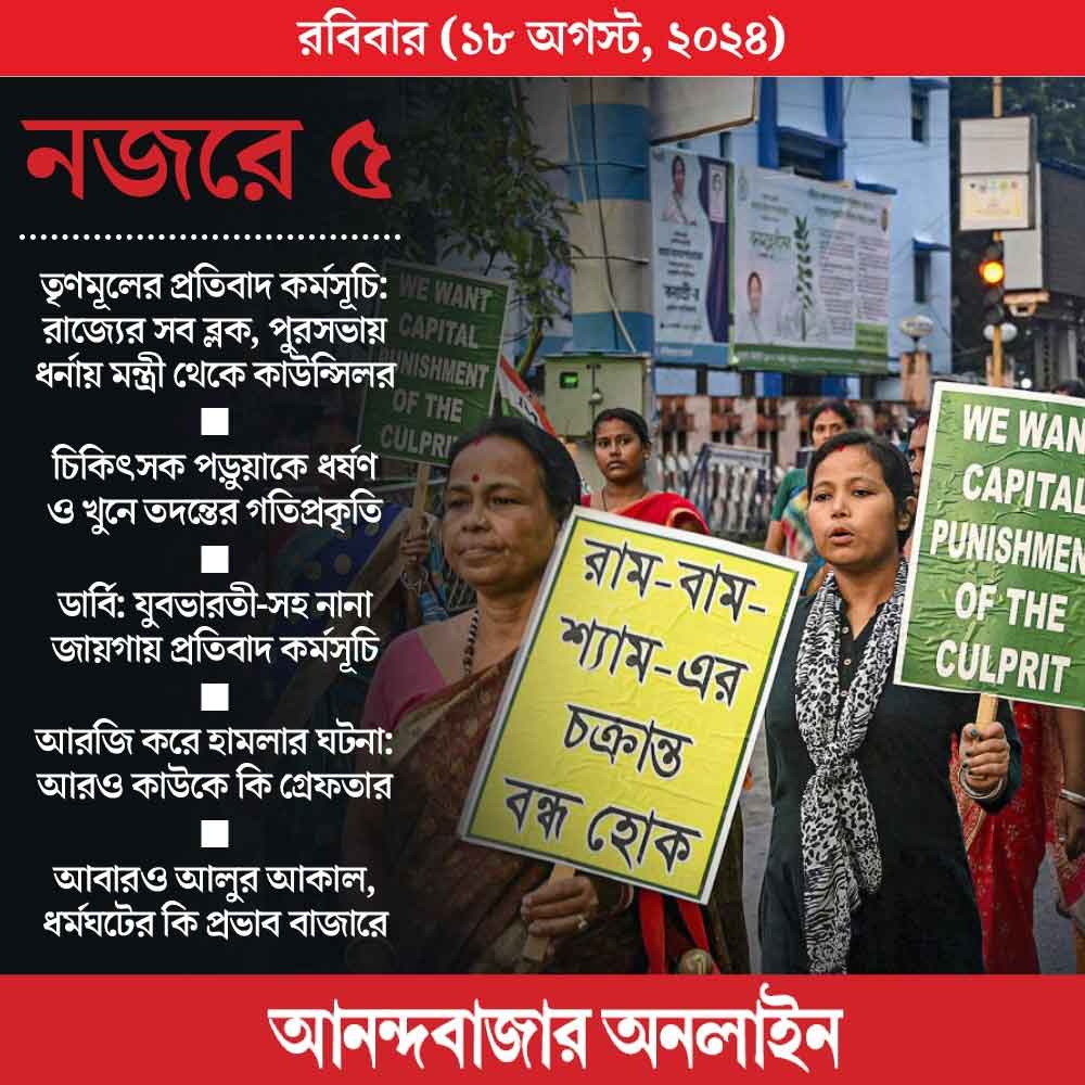 তৃণমূলের মূল দাবি, আরজি করের ধর্ষিতা ও নিহত চিকিৎসকের বিচার চাই। একই ভাবে সিপিএম এবং বিজেপির বিরুদ্ধে রাজনৈতিক চক্রান্তের অভিযোগ তুলে সরব হচ্ছে শাসকদল। শুক্রবার এই দাবিতেই মৌলালি থেকে ধর্মতলার ডোরিনা ক্রসিং পর্যন্ত মিছিল করেছিলেন মমতা। অনেকের মতে, আরজি কর-কাণ্ডে তৃণমূল যখন ‘কোণঠাসা’ তখন পাল্টা সেই সংগঠনকে রাস্তায় নামাতে চেয়েছেন তৃণমূলনেত্রী। আজ শাসকদলের কর্মসূচিতে নজর থাকবে।