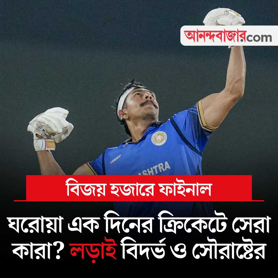 ভারতের ঘরোয়া এক দিনের ক্রিকেটে সেরা দল কারা, জানা যাবে আজ। বিজয় হজারে ট্রফির ফাইনাল আজ। মুখোমুখি বিদর্ভ ও সৌরাষ্ট্র। সেমিফাইনালে কর্নাটককে হারিয়েছে বিদর্ভ। অন্য দিকে পঞ্জাবকে হারিয়ে ফাইনালে উঠেছে সৌরাষ্ট্র। বেঙ্গালুরুতে খেলা শুরু দুপুর ১:৩০ থেকে। খেলা দেখা যাবে স্টার স্পোর্টস চ্যানেল ও জিয়োহটস্টার অ্যাপে।