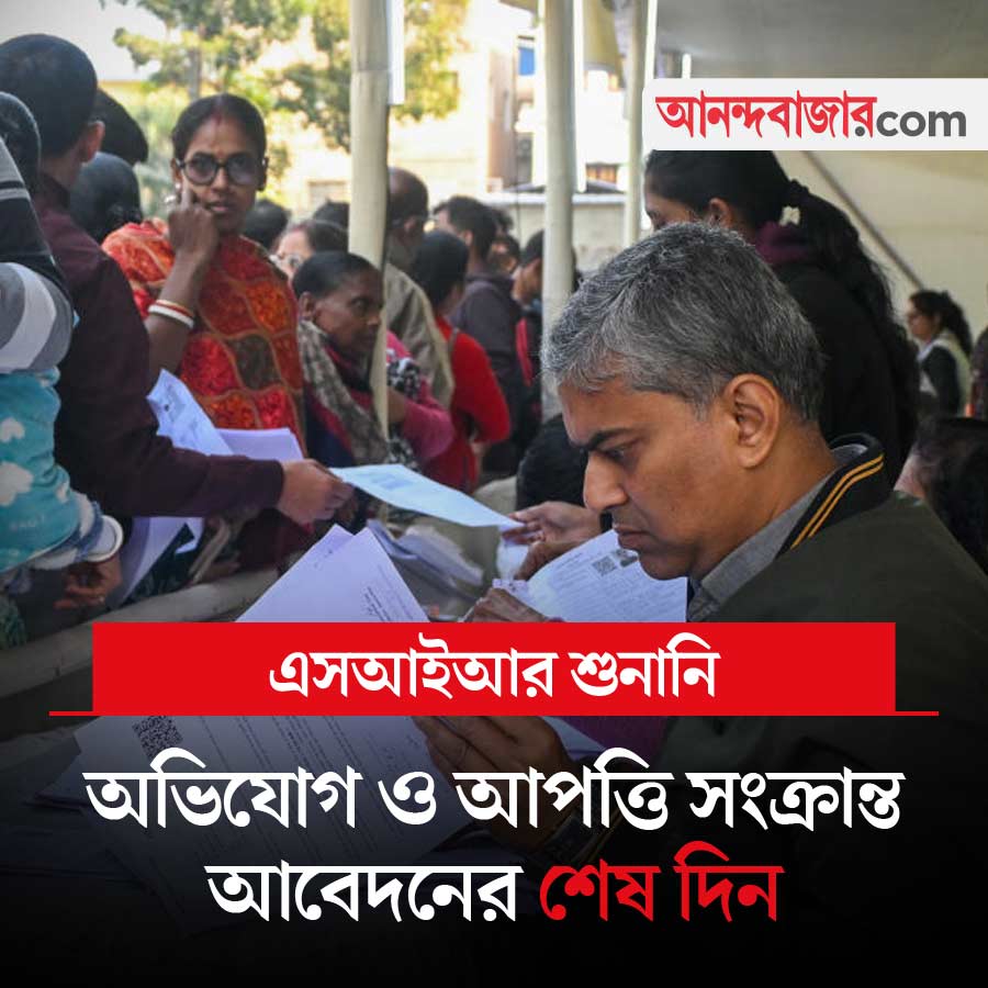 বাংলায় বিশেষ নিবিড় সংশোধনের ভোটারদের শুনানি চলছে। গত ২৭ ডিসেম্বর থেকে জেলায় জেলায় ওই শুনানি শুরু হয়েছে। 'নো ম্যাপিং' এবং তথ্যগত অসঙ্গতি (লজিক্যাল ডিসক্রিপেন্সি) ভোটারদের শুনানি করছে কমিশন। শুনানিতে গতি আনতে অতিরিক্ত কর্মী নিয়োগ করেছে কমিশন। প্রথম দিকে শুনানি নিয়ে একাধিক ‘অব্যবস্থা’র অভিযোগ ওঠে। পরে শুনানি প্রক্রিয়া কিছুটা শিথিল করা হয়। ৮৫ বছরের বেশি এবং অসুস্থ, প্রতিবন্ধী ভোটারদের শুনানিকেন্দ্রে যাওয়া থেকে অব্যাহতি দেয় কমিশন। অন্য দিকে, খসড়া তালিকা নিয়ে অভিযোগ ও আপত্তির সময়সীমা বৃদ্ধি করেছিল কমিশন। সোমবার সেই সময়সীমা শেষ হচ্ছে। এই অবস্থায় আজ এসআইআর সংক্রান্ত খবরে দিকে নজর থাকবে।