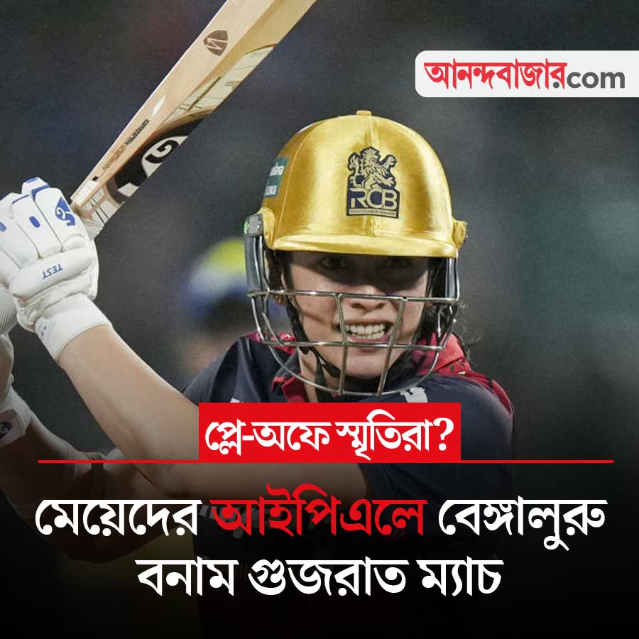 মেয়েদের আইপিএলে স্বপ্নের ফর্মে রয়েছে স্মৃতি মন্ধানার রয়্যাল চ্যালেঞ্জার্স বেঙ্গালুরু। চারটি ম্যাচ খেলে চারটিতেই জিতেছে তারা। আজ বিপক্ষে গুজরাত জায়ান্টস। আজ জিতলেই প্লে-অফ নিশ্চিত হয়ে যাবে বেঙ্গালুরুর। খেলা শুরু সন্ধ্যা ৭:৩০ থেকে। খেলা দেখা যাবে স্টার স্পোর্টস চ্যানেল ও জিয়োহটস্টার অ্যাপে।
