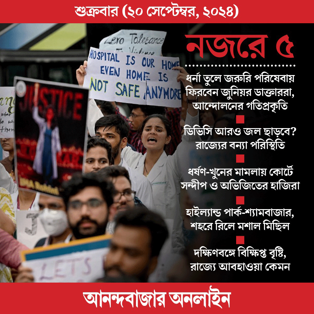 ৪২ দিন পর আংশিক ভাবে কর্মবিরতি তুলে নিলেন জুনিয়র ডাক্তারেরা। বৃহস্পতিবার জেনারেল বডি (জিবি)-র বৈঠকের পর এই সিদ্ধান্ত নেওয়া হয়েছে আন্দোলনকারীদের তরফে। গত ৯ অগস্ট আরজি কর মেডিক্যাল কলেজে এক মহিলা চিকিৎসকের দেহ উদ্ধারের ঘটনার পর থেকে কর্মবিরতি পালন করছেন তাঁরা। গত ৯ দিন ধরে সল্টলেকে স্বাস্থ্য ভবনের সামনে তাঁদের ধর্না চলেছে। মুখ্যমন্ত্রী মমতা বন্দ্যোপাধ্যায়ের সঙ্গে বৈঠকও হয়েছে তাঁদের। বুধবার নবান্নে বৈঠক হয় মুখ্যসচিব মনোজ পন্থের সঙ্গে। আপাতত তাঁরা কর্মবিরতি আংশিক ভাবে তুলে নেওয়ার সিদ্ধান্ত নিয়েছেন। বৃহস্পতিবার রাতে স্বাস্থ্য ভবনের সামনের ধর্নামঞ্চ থেকে সাংবাদিক বৈঠক করেন জুনিয়র ডাক্তারেরা। সেখান থেকেই জানানো হয়, শুক্রবার থেকে কর্মবিরতি আংশিক ভাবে তুলে নেওয়া হবে। ধর্নামঞ্চ উঠবে আজ থেকেই। বিকেল ৩টে নাগাদ ধর্নামঞ্চ থেকে সিজিও কমপ্লেক্স পর্যন্ত জুনিয়র ডাক্তারদের একটি মিছিল হবে। এই কর্মসূচির মাধ্যমেই অবস্থান তুলে নেওয়া হবে। শনিবার থেকে বিভিন্ন হাসপাতালে জরুরি পরিষেবায় যোগ দেবেন জুনিয়র ডাক্তারেরা। আজ এই খবরে নজর থাকবে।