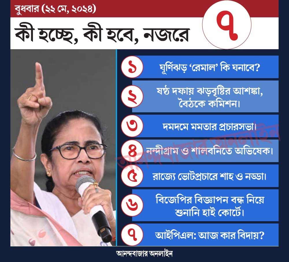 ঘূর্ণিঝড় যদি ঘনায়, তা হলে তার নাম হবে ‘রেমাল’। নামটি ওমানের দেওয়া। আরবি শব্দ ‘রেমাল’-এর বাংলা অর্থ বালি। আজ রাজ্যের আবহাওয়া সংক্রান্ত খবরে নজর থাকবে।