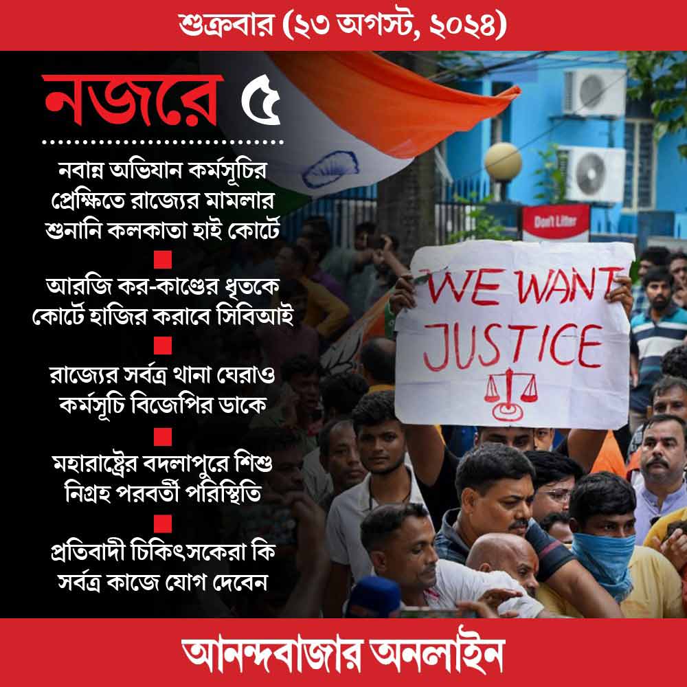 নবান্ন অভিযান নিয়ে শহরের আইনশৃঙ্খলা পরিস্থিতির অবনতি হতে পারে বলে আশঙ্কা প্রকাশ করেছে রাজ্য। বিরোধী রাজনৈতিক দলগুলিও কর্মসূচিতে শামিল হতে পারে। মুখ্যমন্ত্রী মমতা বন্দ্যোপাধ্যায়ের পদত্যাগ-সহ আরজি কর-কাণ্ডে একাধিক দাবি নিয়ে অভিযানের আয়োজন চলছে। পুলিশের অনুমতি ছাড়া এই ধরনের কর্মসূচি কী ভাবে করা যেতে পারে, আদালতে প্রশ্ন তুলেছে রাজ্য। বৃহস্পতিবার সুপ্রিম কোর্টে আরজি কর মামলার শুনানিতে নবান্ন অভিযানের প্রসঙ্গ তুলেছিলেন রাজ্যের আইনজীবী কপিল সিব্বল। প্রধান বিচারপতি ডিওয়াই চন্দ্রচূড় জানান, আইন নিজের পথে চলবে। কিন্তু শান্তিপূর্ণ প্রতিবাদ কর্মসূচিতে কোনও ভাবেই বাধা দেওয়া যাবে না। যাঁরা প্রতিবাদ করবেন তাঁদের বিরুদ্ধে পদক্ষেপ করতে পারবে না পুলিশ। এর পরেই কর্মসূচি বন্ধ করতে আদালতের দ্বারস্থ হয়েছে রাজ্য। এই শুনানির দিকে আজ নজর থাকবে।