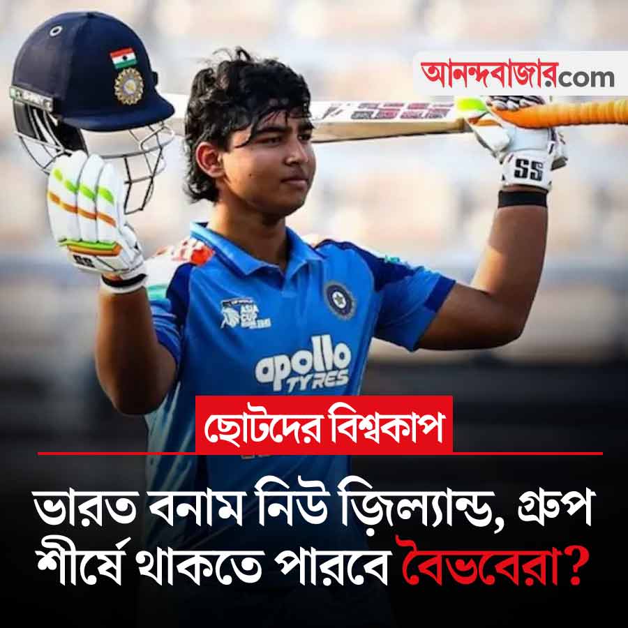ছোটদের বিশ্বকাপে নিজেদের প্রথম দুই ম্যাচ জিতে ভারত ইতিমধ্যেই সুপার সিক্সে জায়গা করে নিয়েছে। আজ গ্রুপের শেষ ম্যাচে নিউ জ়িল্যান্ডের বিরুদ্ধে খেলবে বৈভব সূর্যবংশীরা। জিতলে গ্রুপে এক নম্বরে শেষ করবে ভারত। আজ দুপুর ১টা থেকে শুরু খেলা। সরাসরি দেখা যাবে স্টার স্পোর্টস চ্যানেল ও জিয়োহটস্টার অ্যাপে।