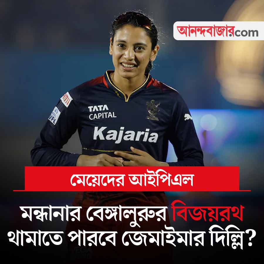 মেয়েদের আইপিএলের পাঁচ ম্যাচ খেলে পাঁচটিতেই জিতেছে রয়্যাল চ্যালেঞ্জার্স বেঙ্গালুরু। ইতিমধ্যেই প্লে-অফে জায়গা করে নিয়েছেন স্মৃতি মন্ধানারা। দিল্লি ক্যাপিটালস প্লে-অফে ওঠার লড়াইয়ে রয়েছে। আজকের ম্যাচে কি মন্ধানাদের জয়রথ থামাতে পারবেন জেমাইমা রদ্রিগেজ়রা? সন্ধ্যা ৭.৩০ মিনিটে শুরু খেলা। সরাসরি দেখা যাবে স্টার স্পোর্টস চ্যানেল ও জিয়োহটস্টার অ্যাপে।