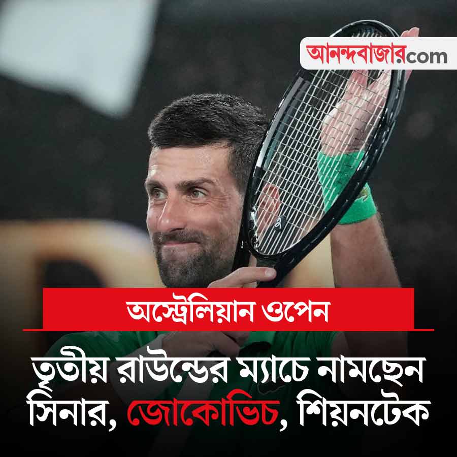 এখনও পর্যন্ত অস্ট্রেলিয়ান ওপেনে ছন্দে রয়েছেন নোভাক জোকোভিচ, ইয়ানিক সিনার ও ইগা শিয়নটেক। সহজে প্রতিপক্ষদের হারিয়ে তৃতীয় রাউন্ডে উঠেছেন তাঁরা। আজ অস্ট্রেলিয়ান ওপেনের সপ্তম দিন সিনার খেলবেন আমেরিকার এলিয়ট স্পিজ্জিরির বিরুদ্ধে। জোকোভিচের খেলা রয়েছে নেদারল্যান্ডসের বটিক ভ্যান দে জ়ান্ডস্কুল্পের বিরুদ্ধে। শিয়নটেকের ম্যাচ রয়েছে আন্না কালিনস্কায়ার বিরুদ্ধে। এই তিন তারকা ছাড়া গত বারের মহিলাদের সিঙ্গলস চ্যাম্পিয়ন ম্যাডিসন কিজ়, নাওমি ওসাকা, জেসিকা পেগুলা, আমান্ডা আনিসিমোভা, ক্যাসপার রুড, লোরেঞ্জো মুসেত্তি, টেলর ফ্রিৎজ় ও এলেনা রিবাকিনার ম্যাচ রয়েছে আজ। খেলা শুরু ভোর ৫.৩০ মিনিট থেকে। সরাসরি দেখা যাবে সোনি স্পোর্টস নেটওয়ার্ক ও সোনিলিভ অ্যাপে।