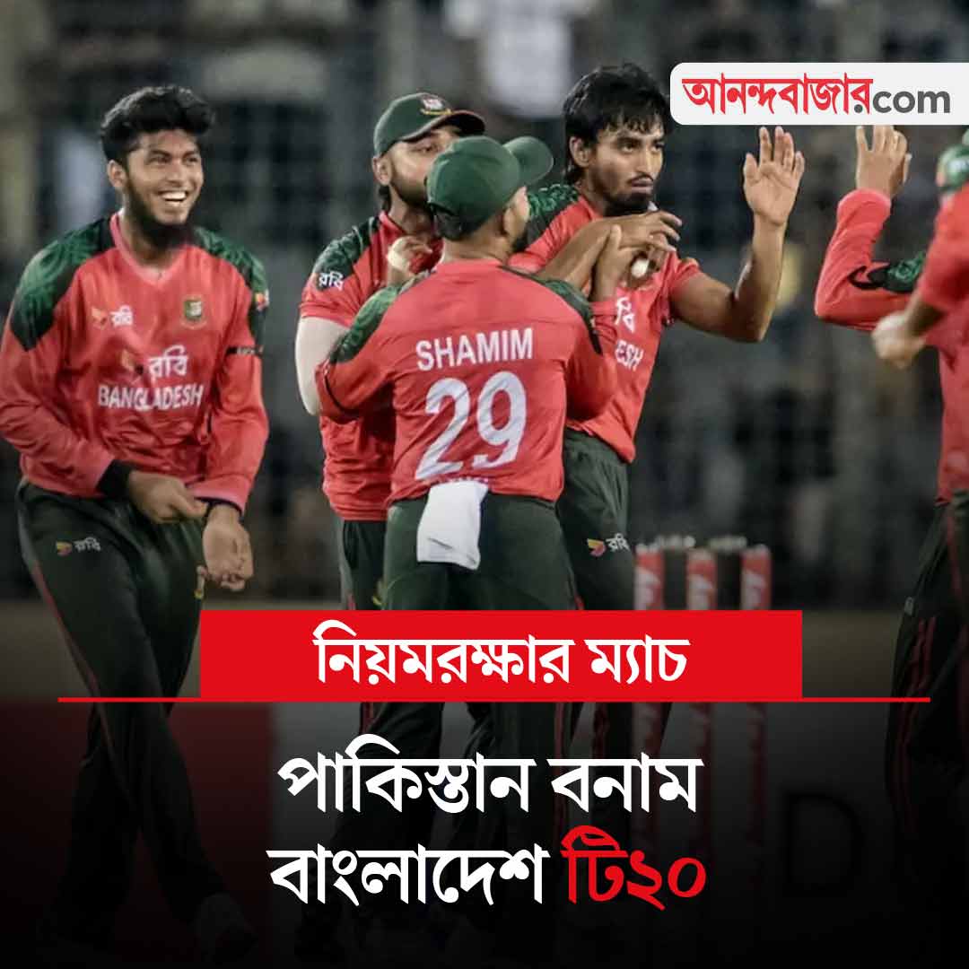 বাংলাদেশ ও পাকিস্তানের তিন ম্যাচের টি-টোয়েন্টি সিরিজ়ের শেষ ম্যাচ আজ। প্রথম দু’টি ম্যাচ জিতে সিরিজ় ইতিমধ্যেই জিতে গিয়েছে বাংলাদেশ। ফলে আজকের ম্যাচ নিয়মরক্ষার। হারলে চুনকাম হবে পাকিস্তান। খেলা শুরু বিকেল ৫:৩০ থেকে।