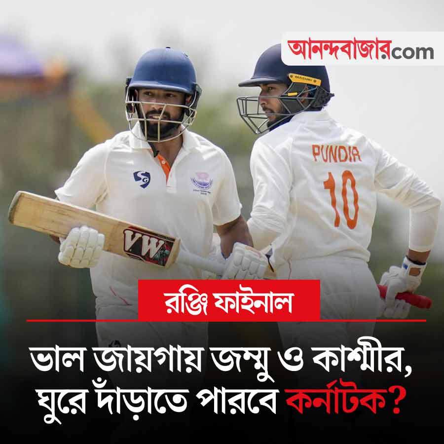 রঞ্জি ট্রফির ফাইনালে প্রথম দিনই দাপট জম্মু ও কাশ্মীরের। কর্নাটকের বিরুদ্ধে প্রথম দিনের শেষে তারা ২ উইকেট হারিয়ে ২৮৪ রান তুলেছে। ১১৭ রান করে অপরাজিত রয়েছেন শুভম পান্দির। প্রথম বার রঞ্জি ফাইনালে উঠে চ্যাম্পিয়ন হওয়ার স্বপ্ন দেখছে জম্মু ও কাশ্মীর। কর্নাটকের বোলারেরা কি ঘুরে দাঁড়াতে পারবেন? পাঁচ দিনের ম্যাচের দ্বিতীয় দিনের খেলা শুরু সকাল ৯:২০ থেকে।