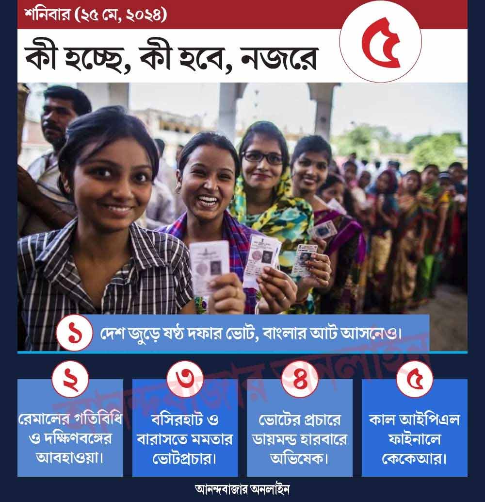 আজ ষষ্ঠ দফায় দেশের ছ’টি রাজ্য এবং দু’টি কেন্দ্রশাসিত অঞ্চলে ভোটগ্রহণ। অষ্টাদশ লোকসভার সাত দফা ভোটের এই প্রাক্-সমাপ্তি পর্বে ভোট হবে ৫৮টি কেন্দ্রে। তার মধ্যে রয়েছে বাংলার ৪২টির মধ্যে আটটি আসন— বাঁকুড়া, বিষ্ণুপুর, তমলুক, কাঁথি, ঘাটাল, মেদিনীপুর, ঝাড়গ্রাম এবং পুরুলিয়া। ষষ্ঠ দফায় উত্তরপ্রদেশের ৮০টি লোকসভা আসনের মধ্যে ১৪, হরিয়ানার ১০টির মধ্যে সবগুলি, বিহারের ৪০টির মধ্যে আটটি, ওড়িশায় ২১টির মধ্যে ছ’টি এবং ঝাড়খণ্ডের ১৪টির মধ্যে চারটিতে ভোট হবে। কেন্দ্রশাসিত অঞ্চল দিল্লির সাতটির মধ্যে সব ক’টি এবং জম্মু ও কাশ্মীরের পাঁচটি লোকসভা কেন্দ্রের মধ্যে একটিতে ভোট হবে এই পর্বে। অনন্তনাগ-রাজৌরিতে ৭ মে তৃতীয় দফায় ভোটগ্রহণের কথা থাকলেও পরে তা পিছিয়ে ষষ্ঠ দফায় করে নির্বাচন কমিশন।