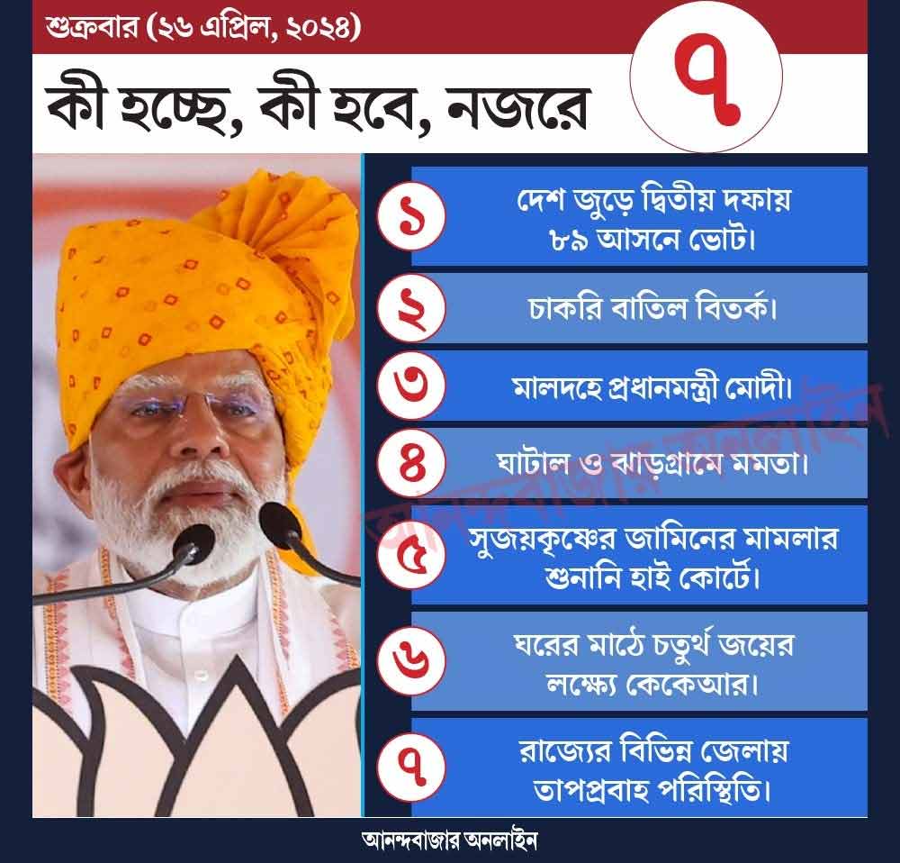 আজ দার্জিলিং, রায়গঞ্জ এবং বালুরঘাট আসনে ভোট চলছে। সেই সময়ে রাজ্যে প্রচারে থাকবেন প্রধানমন্ত্রী নরেন্দ্র মোদী। পুরাতন মালদহে সভা করবেন তিনি। মালদহ উত্তরে বিজেপির প্রার্থী খগেন মুর্মু। মালদহ দক্ষিণে বিজেপির প্রার্থী শ্রীরূপা মিত্র চৌধুরী। তাঁদের হয়ে শুক্রবার সভা করবেন মোদী। লোকসভা নির্বাচনের দিন ঘোষণার আগেই রাজ্যের চার জায়গায় সভা করেছিলেন প্রধানমন্ত্রী। নির্বাচন ঘোষণার পরে কোচবিহার এবং জলপাইগুড়িতে দু’টি সভা হয়েছে তাঁর। তার পর বালুরঘাট কেন্দ্রে বিজেপির রাজ্য সভাপতি সুকান্ত মজুমদারের হয়েও সভা করে গিয়েছেন তিনি। ওই দিন রায়গঞ্জেও সভা করেছেন। ভোট ঘোষণা হওয়ার পর রাজ্যে এই নিয়ে চতুর্থ সফর মোদীর।