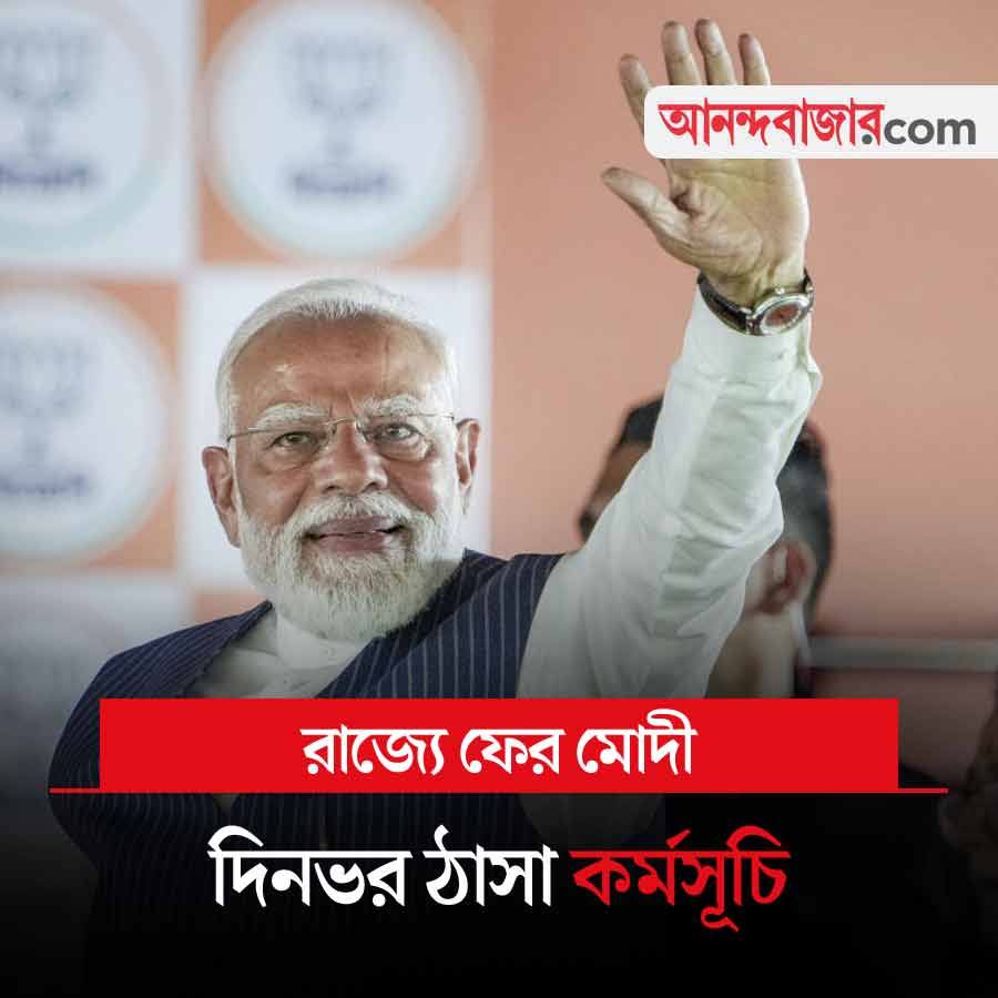 আজ ফের রাজ্যে আসছেন প্রধানমন্ত্রী নরেন্দ্র মোদী। দুপুরে বনগাঁয় প্রথম জনসভা করবেন তিনি। বনগাঁর ঠাকুরনগরে তাঁর জনসভার আয়োজন করা হয়েছে। নির্ধারিত সময় দুপুর ২টো ১৫ মিনিট। সেখানে সভা সেরে মোদী যাবেন হুগলিতে। আরামবাগের হরিপাল এলাকায় তাঁর দ্বিতীয় জনসভা রয়েছে। তার নির্ধারিত সময় বিকেল ৩টে ৪৫ মিনিট। এর পরেই কলকাতায় আসবেন মোদী। কলকাতায় তাঁর রোড শো রয়েছে।
