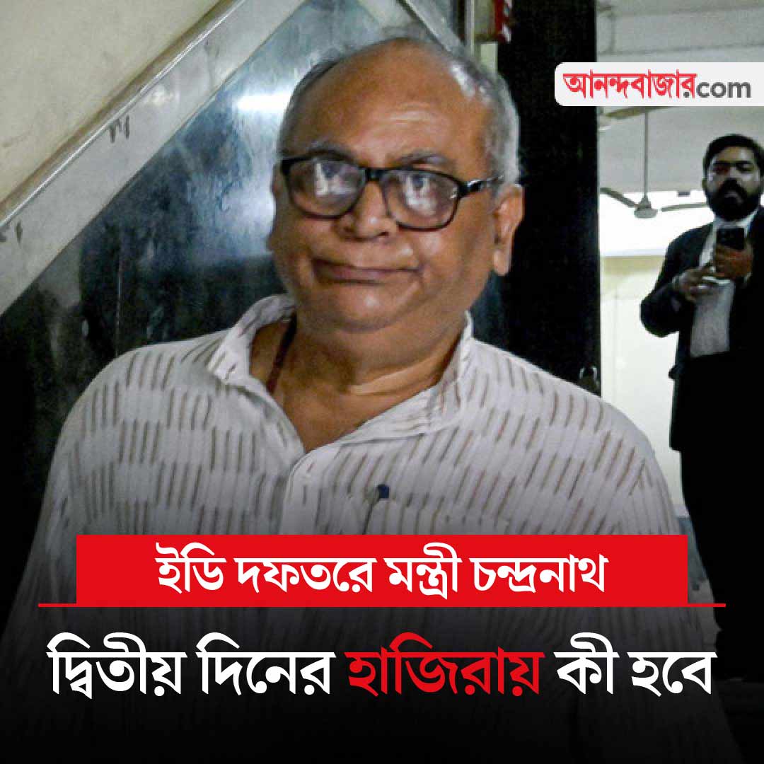 সিজিও কমপ্লেক্সের ই়ডি দফতরে দ্বিতীয় দিনের হাজিরা দিতে যাবেন মন্ত্রী চন্দ্রনাথ সিংহ। বৃহস্পতিবারও তিনি হাজিরা দিয়েছেন। গতকাল তাঁকে জিজ্ঞাসাবাদ করা হয়েছে প্রায় ছ’ঘণ্টা ধরে। প্রাথমিকে নিয়োগ দুর্নীতি মামলার তদন্তে এই জিজ্ঞাসাবাদ চলছে। মন্ত্রীকে হেফাজতে নিয়ে জিজ্ঞাসাবাদ করতে চেয়েছিল কেন্দ্রীয় সংস্থা। তবে আদালত চন্দ্রনাথের জামিন বহাল রেখেছে। সেই সঙ্গে তাঁকে তদন্তে সহযোগিতা করতে বলা হয়েছে। মন্ত্রীও জানিয়েছেন তিনি সহযোগিতা করতে প্রস্তুত।
