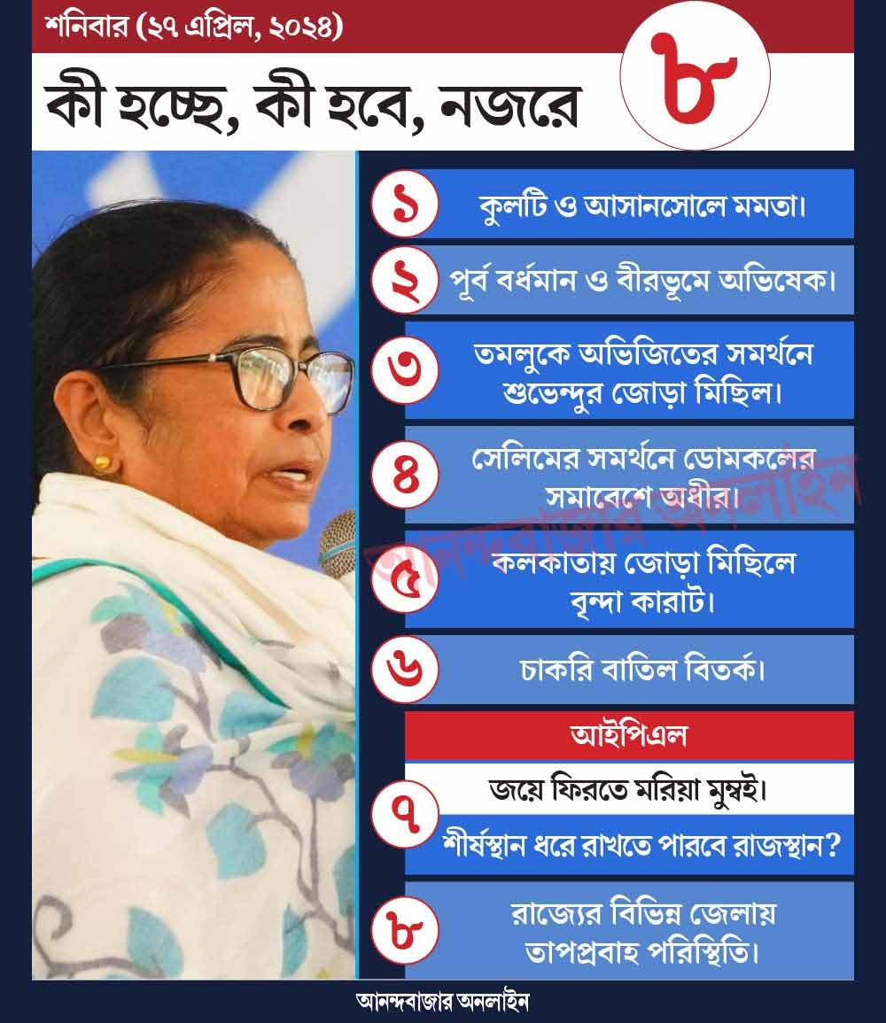 শুক্রবার দ্বিতীয় দফার ভোট মিটেছে। পরের দফার ভোটের লক্ষ্যে ইতিমধ্যেই প্রচার শুরু করেছেন সব দলের প্রথম সারির রাজনীতিকেরা। আজও জেলায় জেলায় কর্মসূচি রয়েছে মমতা বন্দ্যোপাধ্যায়, অভিষেক বন্দ্যোপাধ্যায়, শুভেন্দু অধিকারী, অধীর চৌধুরী, মহম্মদ সেলিমদের। মমতা আসানসোল লোকসভা কেন্দ্রে জোড়া সভা করবেন আজ। তৃণমূলের সেনাপতি অভিষেকেরও দু’টি সভা রয়েছে। একটি পূর্ব বর্ধমানের জামালপুরে, অন্যটি বীরভূমের দুবরাজপুরে। তমলুকের বিজেপি প্রার্থী তথা প্রাক্তন বিচারপতি অভিজিৎ গঙ্গোপাধ্যায়ের সমর্থনে সেখানে জোড়া মিছিল করবেন বিরোধী দলনেতা শুভেন্দু। মুর্শিদাবাদ কেন্দ্রের সিপিএম প্রার্থী সেলিমের সমর্থনে ডোমকলের জনসভায় হাজির থাকবেন প্রদেশ কংগ্রেস সভাপতি তথা বহরমপুরের কংগ্রেস প্রার্থী অধীর। কলকাতায় দু’টি মিছিলে অংশ নেবেন সিপিএম নেত্রী বৃন্দা কারাট এবং জওহরলাল নেহরু বিশ্ববিদ্যালয়ের এসএফআই নেত্রী ঐশী ঘোষ।