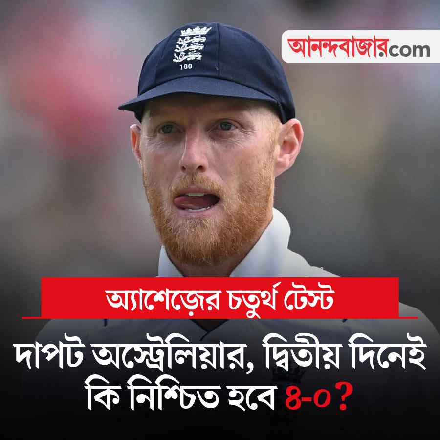 অ্যাশেজ়ের প্রথম তিনটি টেস্টের মতো চতুর্থ টেস্টেও দাপট দেখাচ্ছে অস্ট্রেলিয়া। প্রথম দিনের শেষে তারা এগিয়ে ৪৬ রানে। প্রথম দিন পড়েছে ২০টি উইকেট। মেলবোর্নের দ্বিতীয় দিনেই কি ৪-০ জয় নিশ্চিত করে ফেলবে অস্ট্রেলিয়া? দ্বিতীয় দিনের খেলা শুরু ভোর ৫টা থেকে। খেলা দেখা যাবে স্টার স্পোর্টস চ্যানেল ও জিয়োহটস্টার অ্যাপে।
