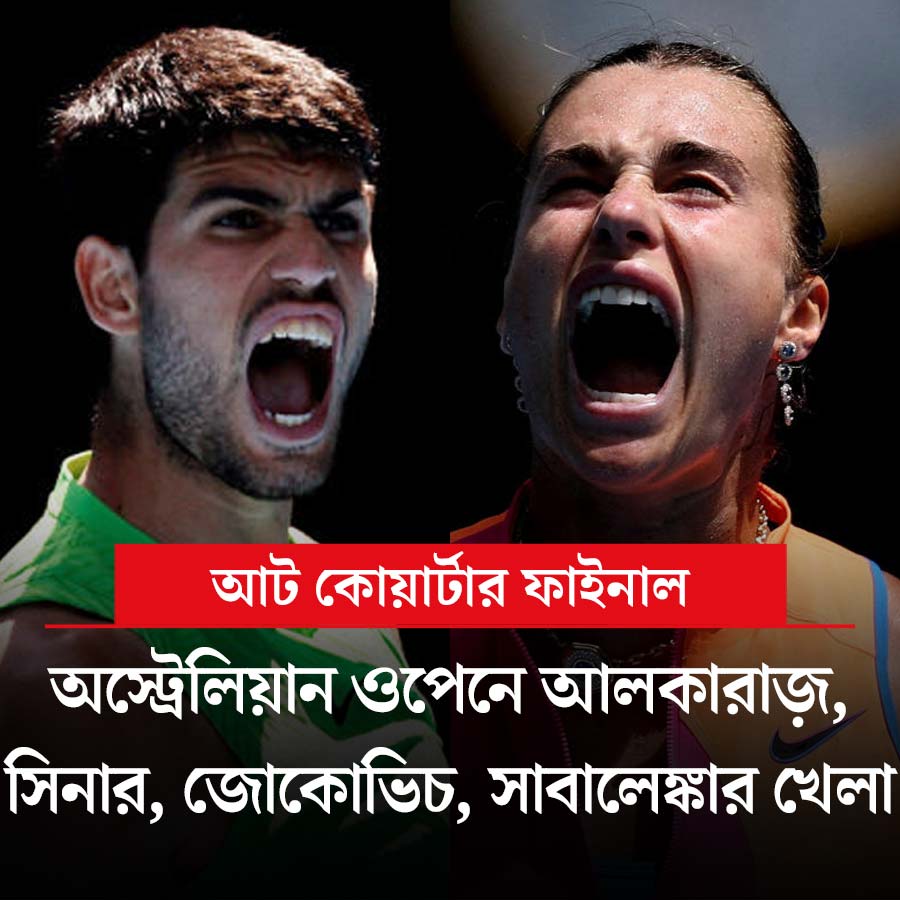 আজ অস্ট্রেলিয়ান ওপেনের চারটি কোয়ার্টার ফাইনাল। খেলবেন শীর্ষ বাছাই কার্লোস আলকারাজ়, দ্বিতীয় বাছাই জানিক সিনার, তৃতীয় বাছাই আলেকজান্ডার জ়েরেভ ও চতুর্থ বাছাই নোভাক জোকোভিচ। আলকারাজ়ের সামনে ষষ্ঠ বাছাই আলেক্স ডিমিনাউর। জোকোভিচের লড়াই পঞ্চম বাছাই লরেঞ্জো মুসেত্তির সঙ্গে। অন্য কোয়ার্টার ফাইনালে জ়েরেভ খেলবেন ২৫ নম্বর বাছাই লার্নার টিয়েনের সঙ্গে। মেয়েদের সিঙ্গলসেও আজ চারটি কোয়ার্টার ফাইনাল। খেলবেন প্রথম ছয় বাছাই। শীর্ষ বাছাই অ্যারিনা সাবালেঙ্কা খেলবেন ২৯ নম্বর বাছাই ইভা জভিচের সঙ্গে। দ্বিতীয় বাছাই ইগা শিয়নটেক মুখোমুখি পঞ্চম বাছাই এলিনা রিবাকিনার। তৃতীয় বাছাই কোকো গফের সামনে দ্বাদশ বাছাই এলিনা স্বিতোলিনা। চতুর্থ বাছাই আমান্ডা আনিসিমোভার লড়াই ষষ্ঠ বাছাই জেসিকা পেগুলার সঙ্গে। খেলা শুরু ভোর ৬টা থেকে। খেলা দেখা যাবো সোনি স্পোর্টস চ্যানেল ও সোনি লিভ অ্যাপে।
