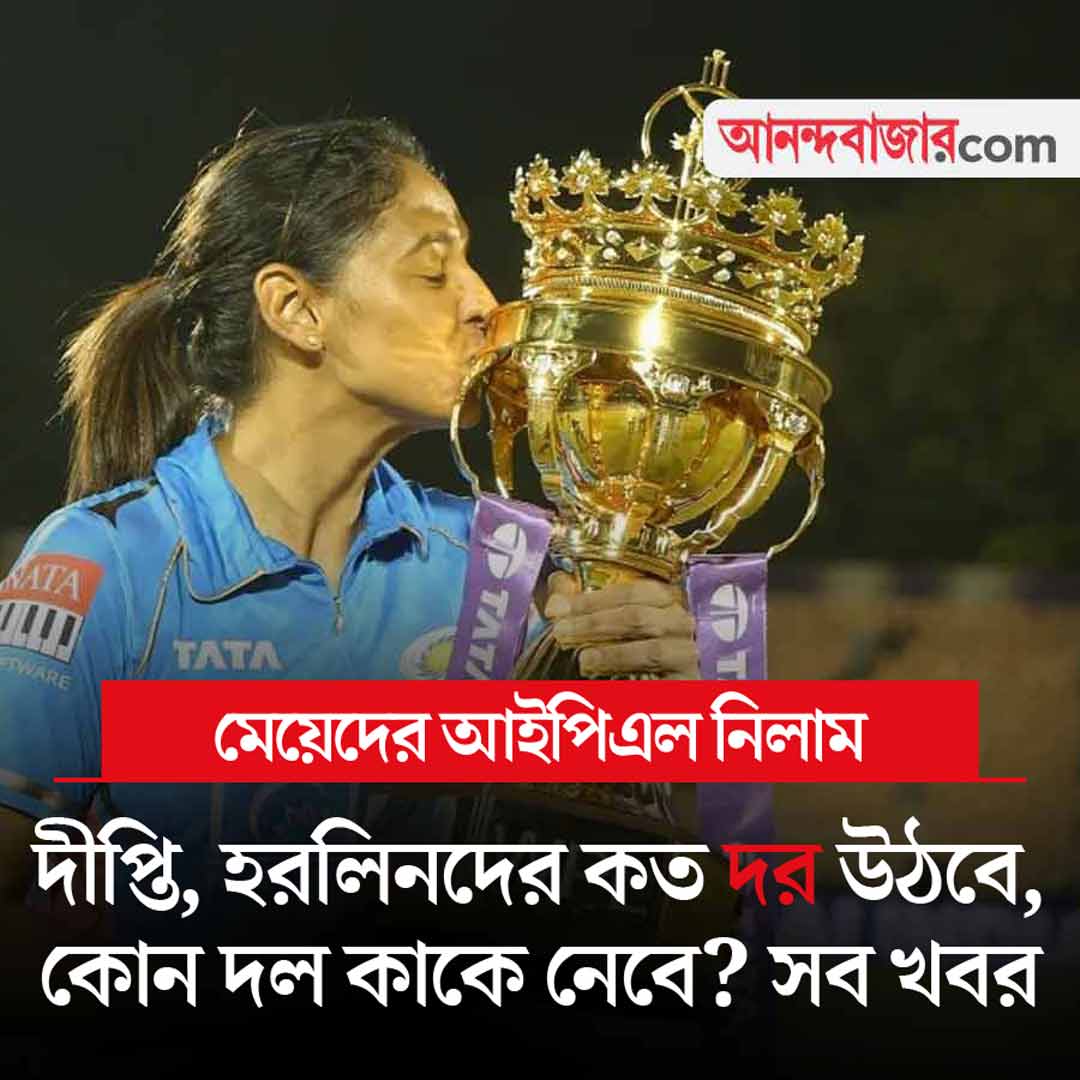 আজ মেয়েদের আইপিএলের নিলাম। বিশ্বকাপজয়ী ভারতীয় দলের ক্রান্তি গৌড়, শ্রী চরণি, রেণুকা সিংহ, স্নেহ রানা, হরলীন দেওল, দীপ্তি শর্মাদের কত দর উঠবে? এই নিলামে নেই ভারত অধিনায়ক হরমনপ্রীত কৌর, স্মৃতি মন্ধানা, জেমাইমা রদ্রিগেজ়, আমনজ্যোৎ কৌর, রিচা ঘোষ, শেফালি বর্মা। কারণ, সংশ্লিষ্ট দল এ বার তাঁদের ধরে রেখেছে। কোন দল কাকে নেবে? নিলাম শুরু দুপুর ২:৩০ থেকে। দেখা যাবে স্টার স্পোর্টস চ্যানেল ও জিয়োহটস্টার অ্যাপে।