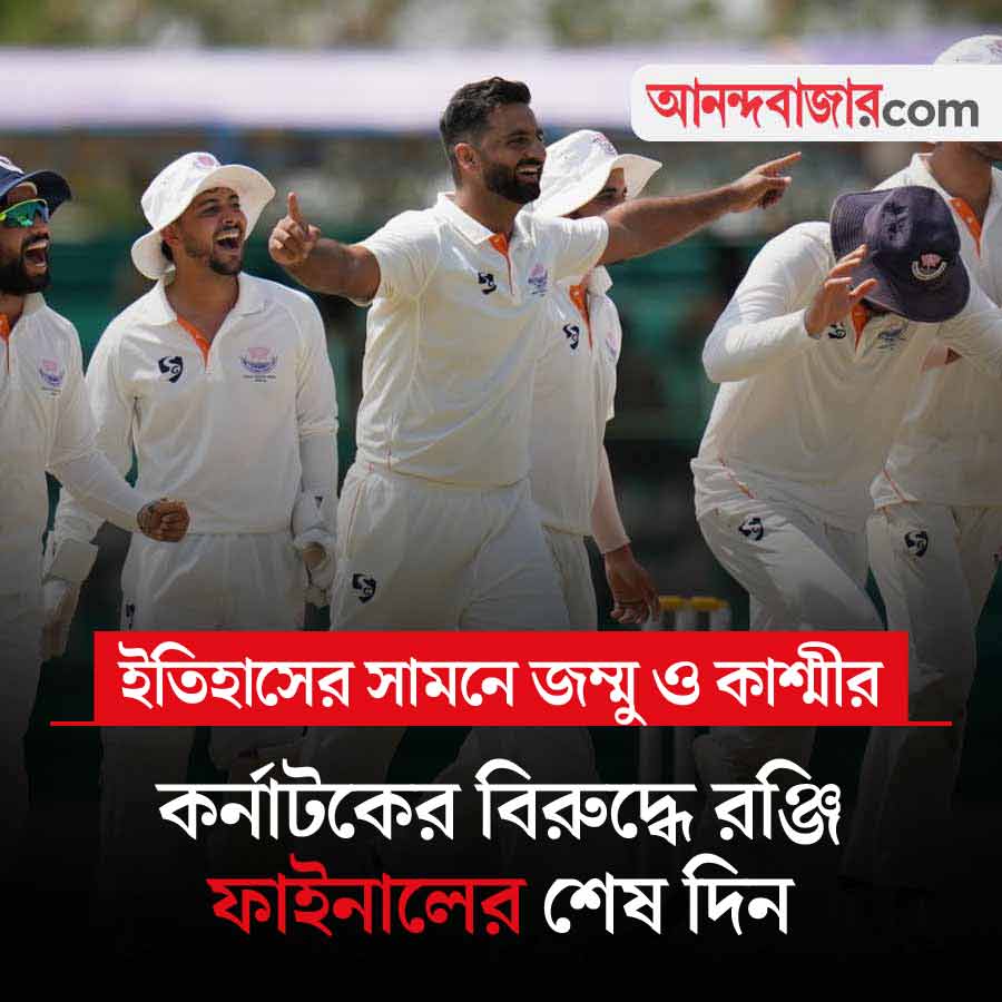 রঞ্জি চ্যাম্পিয়ন হওয়ার দোরগোড়ায় জম্মু ও কাশ্মীর। প্রথম বার ফাইনালে উঠেই চ্যাম্পিয়ন হওয়ার স্বপ্ন দেখছে তারা। তাদের বিরুদ্ধে কর্নাটক কোণঠাসা। প্রথম ইনিংসে জম্মু ও কাশ্মীরের ৫৮৪ রানের জবাবে কর্নাটক ২৯৩ রানে শেষ হয়ে গিয়েছে। দ্বিতীয় ইনিংসে চতুর্থ দিনের শেষে জম্মু ও কাশ্মীর ৪ উইকেটে ১৮৬ রান তুলেছে। তারা ৪৭৭ রানে এগিয়ে। আজ শেষ দিনের খেলা। সকাল ৯:৩০ থেকে খেলা শুরু। খেলা দেখা যাবে স্টার স্পোর্টস চ্যানেল ও জিয়োহটস্টার অ্যাপে।