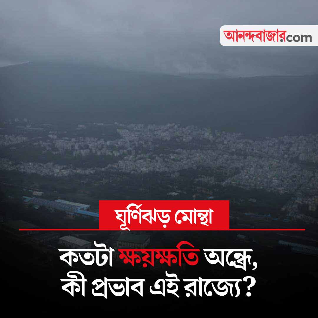 বঙ্গোপসাগরের উপর দিয়ে স্থলভাগের দিকে এগিয়ে আসছে ঘূর্ণিঝড় মোন্থা। আজ সকালে ‘প্রবল’ ঘূর্ণিঝড়ে পরিণত হওয়ার কথা। রাতেই অন্ধ্রপ্রদেশ উপকূলে আছড়ে পড়তে পারে। এর প্রভাবে কলকাতা, হাওড়া, হুগলি, উত্তর ও দক্ষিণ ২৪ পরগনা, পূর্ব ও পশ্চিম মেদিনীপুরে হালকা থেকে মাঝারি বৃষ্টির পাশাপাশি ঘণ্টায় ৩০ থেকে ৪০ কিলোমিটার গতিতে দমকা হাওয়া বইতে পারে। ওই জেলাগুলিতে হলুদ সতর্কতা জারি করা হয়েছে। এর মধ্যে দক্ষিণ ২৪ পরগনা এবং পূর্ব মেদিনীপুরে হতে পারে ভারী (৭ থেকে ১১ সেন্টিমিটার) বৃষ্টি। উত্তরবঙ্গের দুই জেলা, দার্জিলিং এবং কালিম্পঙে মঙ্গলবার হালকা বৃষ্টির সম্ভাবনা রয়েছে। বাকি জেলায় ঝড়বৃষ্টির সম্ভাবনা নেই।