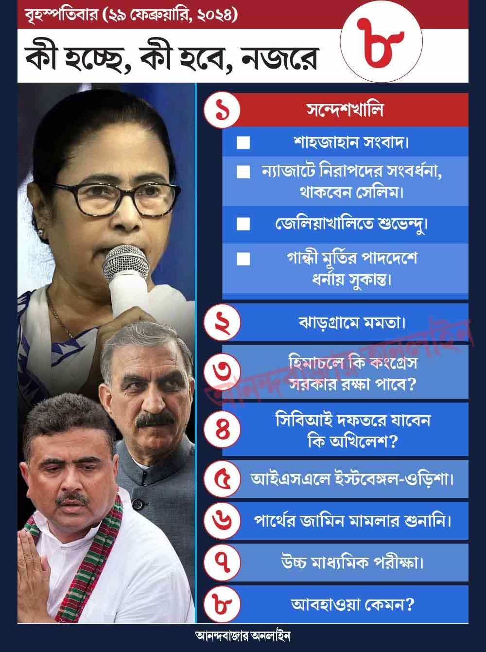 গত কয়েক দিন ধরেই রাজ্য রাজনীতির কেন্দ্রে রয়েছে সন্দেশখালি। আজও তার কোনও অন্যথা হচ্ছে না। সন্দেশখালিকে কেন্দ্র করে দিনভর কর্মসূচি রয়েছে। কোনওটা সন্দেশখালিতে। কোনওটা কলকাতায়। বৃহস্পতিবার মেয়ো রোডে গান্ধী মূর্তির পাদদেশে বিজেপির ধর্না কর্মসূচিতে যোগ দেবেন দলের রাজ্য সভাপতি সুকান্ত মজুমদার। কলকাতা হাই কোর্টের অনুমতি সাপেক্ষে বুধবার শুরু হয়েছিল বিজেপির ধর্না। সন্দেশখালিতে মহিলাদের উপর শাসকদলের নেতাদের নির্যাতনের অভিযোগ ও অভিযুক্ত নেতা শাহজাহান শেখের গ্রেফতারের দাবিতে এই ধর্না কর্মসূচি। বুধবার এই ধর্নায় যোগ দেন বিজেপির প্রাক্তন রাজ্য সভাপতি দিলীপ ঘোষ ও বিরোধী দলনেতা শুভেন্দু অধিকারী। আজ ধর্নার শেষ দিনে ফের সন্দেশখালিতে যাওয়ার কর্মসূচি রয়েছে শুভেন্দুর। তাঁকে সন্দেশখালি বিধানসভা এলাকার জেলিয়াখালিতে যাওয়ার অনুমতি দিয়েছে কলকাতা হাই কোর্ট। নির্দেশে বলা হয়েছে, বিরোধী দলনেতার সঙ্গে সেখানে যেতে পারবেন শিলিগুড়ির বিজেপি বিধায়ক শঙ্কর ঘোষ। প্রসঙ্গত, কলকাতা হাই কোর্টের নির্দেশেই গত সপ্তাহে সতীর্থ শঙ্করকে নিয়ে সন্দেশখালি গিয়েছিলেন বিরোধী দলনেতা। পাশাপাশি, সিপিএমেরও কর্মসূচি রয়েছে আজ।