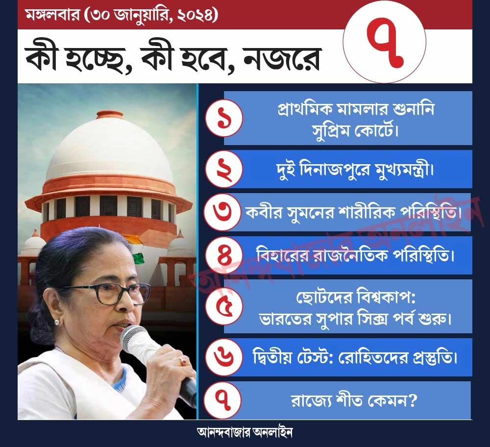 সোমবার কোচবিহারের পর আজ দুই দিনাজপুরের ইসলামপুর ও বালুরঘাটে মুখ্যমন্ত্রী মমতা বন্দ্যোপাধ্যায় সরকারি পরিষেবা প্রদান করবেন। আজ বিকেল ৪টেয় মমতার প্রশাসনিক বৈঠক ইসলামপুরে। রাত্রিবাসও করবেন এই জেলায়। সোমবার দুপুরে চোপড়া এবং ইসলামপুরে হেলিকপ্টারের ‘টেস্ট ল্যান্ডিং’ হয়। চোপড়া ময়দানে সেই প্রস্তুতি খতিয়ে দেখেন স্থানীয় বিধায়ক হামিদুল রহমান। ইসলামপুর স্কুল ময়দানের প্রস্তুতি দেখভাল করতে দেখা যায় রাজ্যের মন্ত্রী গোলাম রব্বানিকে। হামিদুল জানান, চোপড়ায় নেমে মুখ্যমন্ত্রী এক কিলোমিটার রাস্তা হাঁটবেন। বস্তুত, পঞ্চায়েত নির্বাচন থেকে ইসলামপুর এবং চোপড়া এলাকায় আব্দুল করিম চৌধুরীর সঙ্গে কানাইলাল আগরওয়ালের মতবিরোধ শুরু হয়েছে। এর আগে একাধিক বার প্রকাশ্যে দলীয় সিদ্ধান্তের বিরোধিতা করে প্রকাশ্যে মন্তব্য করতে শোনা গিয়েছে আব্দুলকে। এই প্রেক্ষিতে তৃণমূল নেত্রী কী বার্তা দেন, তা নিয়ে কৌতূহল তৈরি হয়েছে। একই দিনে আজ দিনভর রাজ্য বিজেপির সভাপতি সুকান্ত মজুমদারের একাধিক রাজনৈতিক এবং সাংগঠনিক কর্মসূচি রয়েছে।