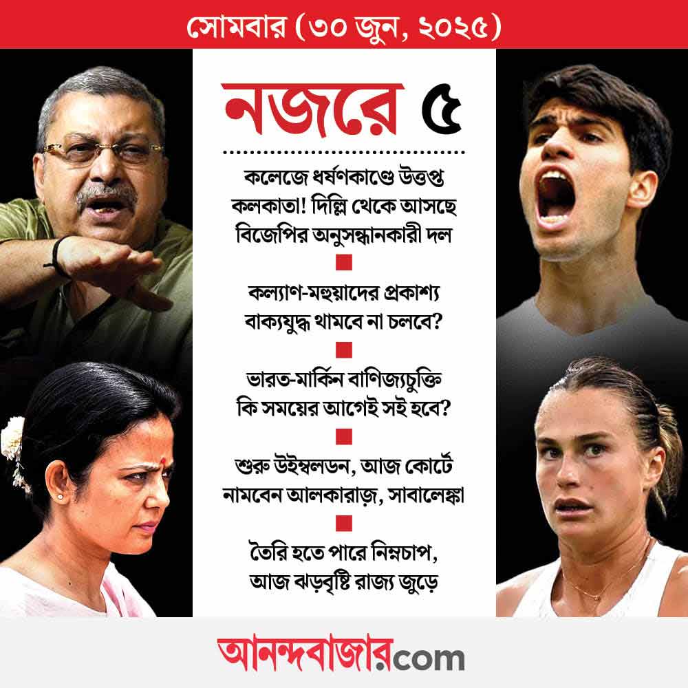আজ থেকে শুরু উইম্বলডন। ঘাসের কোর্টে গ্র্যান্ড স্ল্যাম জেতার লক্ষ্যে নামবেন বিশ্বের টেনিস তারকারা। প্রথম দিন নামবেন পুরুষদের দ্বিতীয় বাছাই স্পেনের কার্লোস আলকারাজ় ও তৃতীয় বাছাই জার্মানির আলেকজ়ান্ডার জ়েরেভ। আলকারাজ়ের মুখোমুখি ইটালির ফ্যাবিয়ো ফগনিনি। জ়েরেভের সামনে নেদারল্যান্ডসের আর্থার রিন্ডার্কনেক। মহিলাদের শীর্ষবাছাই এরিনা সাবালেঙ্কার খেলা রয়েছে কানাডার কার্সন ব্র্যানস্টাইনের বিরুদ্ধে। খেলা শুরু ভারতীয় সময় দুপুর সাড়ে ৩টে থেকে। সরাসরি দেখা যাবে স্টার স্পোর্টস চ্যানেল ও জিয়োহটস্টার অ্যাপে।