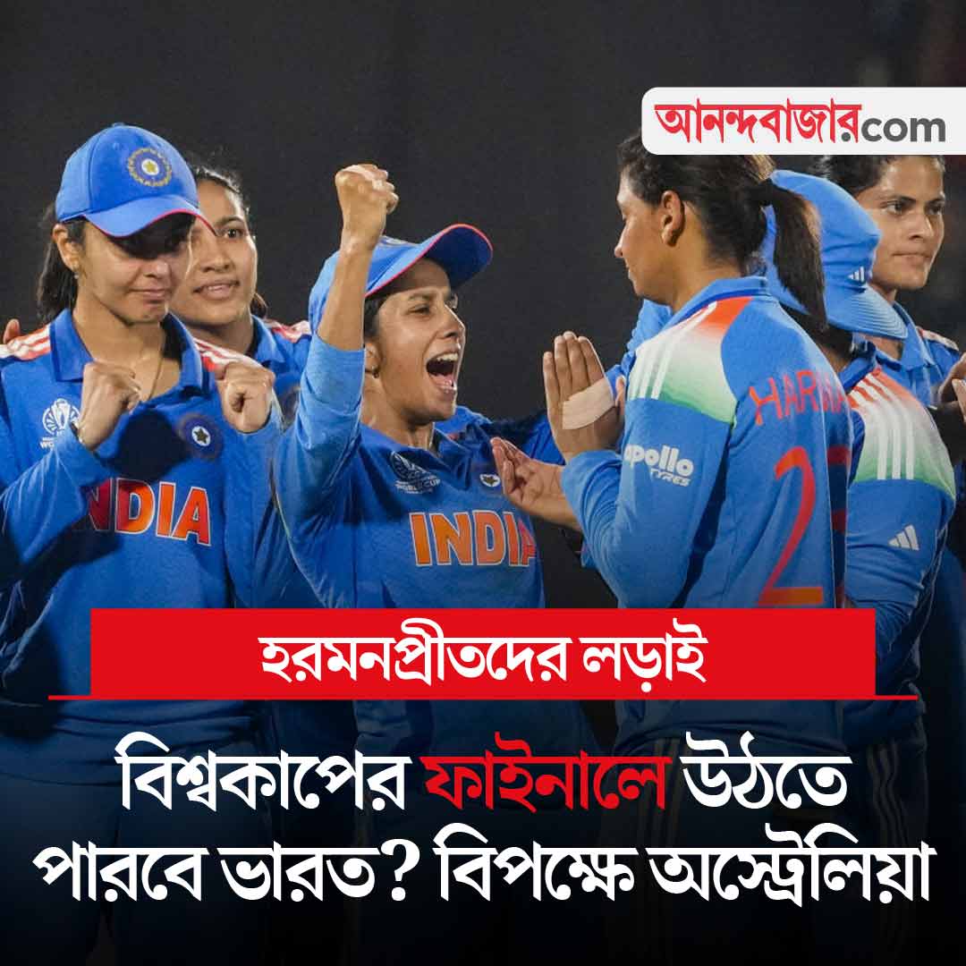 মহিলাদের বিশ্বকাপে আজ মহারণ। ফাইনালে ওঠার লড়াইয়ে নামছে ভারত। হরমনপ্রীত কৌরেরা সেমিফাইনাল খেলতে নামছেন। ভারতের প্রতিপক্ষ প্রতিযোগিতার সবচেয়ে শক্তিশালী দল অস্ট্রেলিয়া। প্রায় সব বিভাগেই অপ্রতিরোধ্য দেখাচ্ছে অসিদের। বিশ্বকাপ থেকে ছিটকে গিয়েছেন ভারতের প্রতিকা রাওয়াল। দলে এসেছেন শেফালি বর্মা। চোট সরিয়ে এই ম্যাচে ফিরছেন অস্ট্রেলিয়ার অধিনায়ক অ্যালিসা হিলি। ভারত কি পারবে ফাইনালে উঠতে? খেলা শুরু বিকেল ৩টে থেকে। খেলা দেখা যাবে স্টার স্পোর্টস চ্যানেল ও জিয়োহটস্টার অ্যাপে।