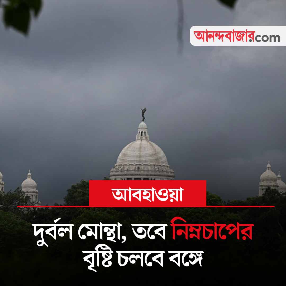 ঘূর্ণিঝড় মোন্থা শক্তি হারিয়ে গভীর নিম্নচাপে পরিণত হয়েছে। আগামী কয়েক দিনে তা উত্তর-পশ্চিম দিকে এগিয়ে আরও শক্তিক্ষয় করবে। এর প্রভাবে দক্ষিণবঙ্গের বেশ কিছু জেলায় ভারী বৃষ্টির পূর্বাভাস রয়েছে। বৃষ্টি হতে পারে কলকাতাতেও। উত্তরবঙ্গেও ভারী বর্ষণের সম্ভাবনার কথা জানিয়েছে আলিপুর আবহাওয়া দফতর। এই সংক্রান্ত খবরের দিকে নজর থাকবে।