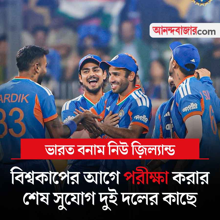 আজ ভারত বনাম নিউ জ়িল্যান্ড পঞ্চম টি-টোয়েন্টি ম্যাচ। এটিই সিরিজ়ের শেষ ম্যাচ। বিশ্বকাপের আগেও দুই দলের এটিই প্রস্তুতির শেষ সুযোগ। দুই দলই যাবতীয় পরীক্ষা-নিরীক্ষা সেরে নেবে। আগের ম্যাচে এই পরীক্ষা করতে গিয়েই হারতে হয়েছে ভারতকে। আজ কি হবে? খেলা শুরু সন্ধ্যা ৭টা থেকে। খেলা দেখা যাবে স্টার স্পোর্টস চ্যানেল ও জিয়োহটস্টার অ্যাপে।