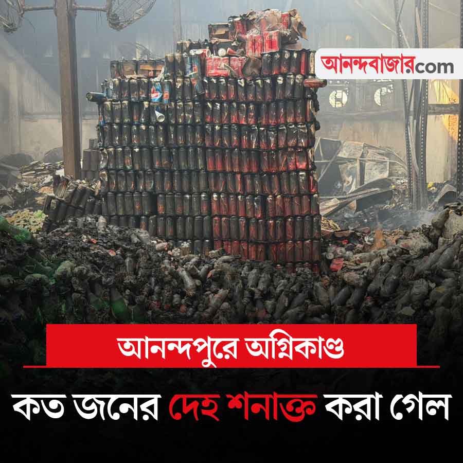 আনন্দপুরের অগ্নিকাণ্ডের পর পাঁচ দিন কেটে গিয়েছে। এখনও নিখোঁজ ২৭ জন! পুলিশ সূত্রে খবর, গতকাল পর্যন্ত ঘটনাস্থল থেকে ২১টি দেহাংশ উদ্ধার হয়েছে। তবে মৃতের সংখ্যা ঠিক কত, তা এখনও স্পষ্ট নয়। উদ্ধার হওয়া দেহাংশগুলি কাদের, তা-ও জানা যায়নি। সেগুলি ফরেনসিক পরীক্ষার জন্য পাঠানো হয়েছে। ঘটনাস্থলে এখনও চলছে দেহাংশ খোঁজার কাজ। ইতিমধ্যে মোমো কোম্পানির সেই গুদামের ম্যানেজার মনোরঞ্জন শিট এবং ডেপুটি ম্যানেজার রাজা চক্রবর্তীকে গ্রেফতার করেছে পুলিশ। ধৃতদের শুক্রবার বারুইপুর মহকুমা আদালতে হাজির করিয়ে হেফাজতে নেওয়া হয়েছে। এ ছাড়া, আগেই গ্রেফতার হয়েছেন দ্বিতীয় গুদামটির মালিক গঙ্গাধর দাস। ফলে সব মিলিয়ে ওই ঘটনায় ধৃতের সংখ্যা বেড়ে হয়েছে তিন। আনন্দপুরের ঘটনায় গতকাল শোকপ্রকাশ করেছেন প্রধানমন্ত্রী নরেন্দ্র মোদী। প্রধানমন্ত্রী জাতীয় তহবিল থেকে মৃতদের পরিবারকে ২ লক্ষ টাকা এবং আহতদের ৫০,০০০ টাকা করে আর্থিক সাহায্যের ঘোষণা করেছেন তিনি। আনন্দপুরে মৃতের সংখ্যা বেড়ে কত হল, কতগুলি দেহ শনাক্ত হল, আজ সে সংক্রান্ত খবরে নজর থাকবে।