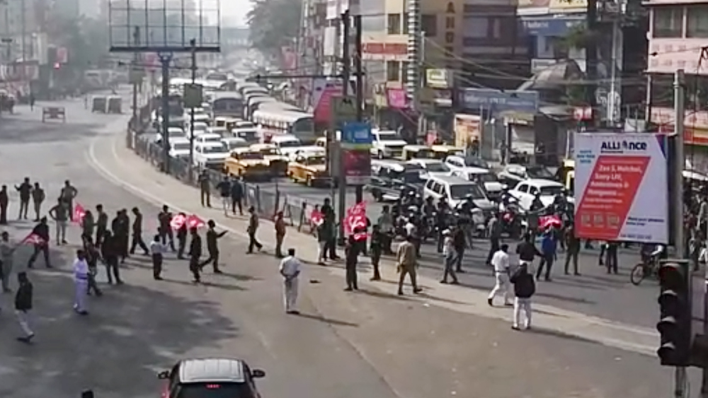 • বারাসতে বন্ধের সমর্থনে ধর্মঘটীদের মিছিল।