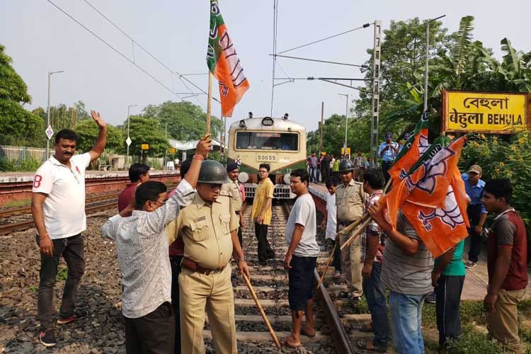 বেহুলাতে রেল অবরোধে বিজেপি কর্মীরা। নিজস্ব চিত্র।