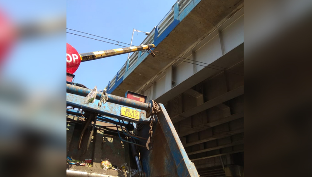 লরির ধাক্কায় ওভারহেডে বিদ্যুৎ সংযোগ বিচ্ছিন্ন হওয়াতে বন্ধ ছিল শিয়ালদহ দক্ষিণ শাখার ট্রেন চলাচল। —নিজস্ব চিত্র।