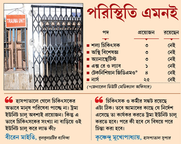 হাসপাতালের সুপার কৃষ্ণেন্দু মুখোপাধ্যায়ের দায়সারা উত্তর, “চিকিৎসক ও কর্মীর সঙ্কট রয়েছে এটা ঠিক। তবে আমাদের কাছে যে নির্দেশ এসেছে তা কার্যকর করতে ট্রমা ইউনিট চালু করতে হবে। পরে কী হবে সে বিষয়ে পরে চিন্তা করা হবে। এখন ইউনিট চালু করাই আমাদের লক্ষ্য।” জেলা মুখ্য স্বাস্থ্য আধিকারিক গিরীশচন্দ্রবাবুর কথায়, ‘‘ওই ইউনিটের জন্য চিকিৎসক ও কর্মী নিয়োগের বিষয়ে স্বাস্থ্যভবনে জানিয়েছি।’’