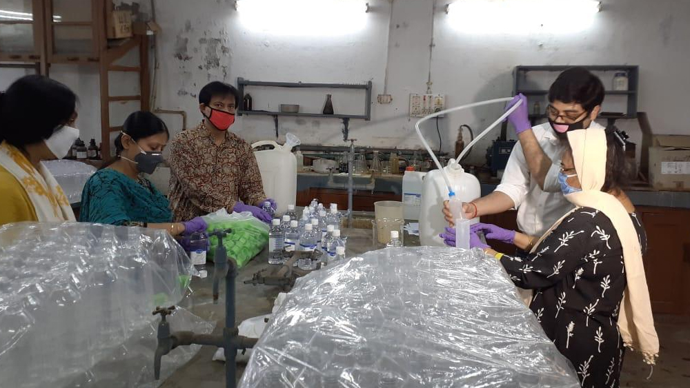 স্যানিটাইজার তৈরির জন্য হু যে গাইডলাইন দিয়েছে, হুবহু তা অনুসরণ করেই স্যানিটাইজার তৈরি করা হচ্ছে কলকাতা বিশ্ববিদ্যালয়ে।