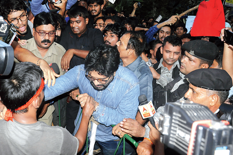 যাদবপুর বিশ্ববিদ্যালয়ে ছাত্রদের হেনস্থা বাবুল সুপ্রিয়কে। বৃহস্পতিবার। ছবি: শশাঙ্ক মণ্ডল