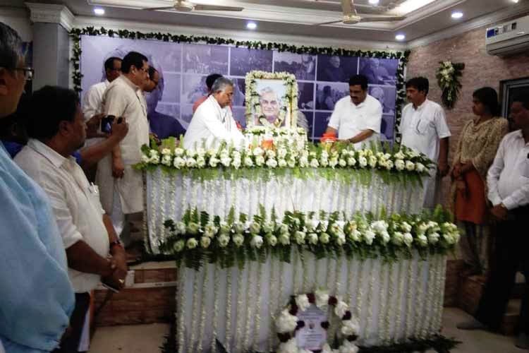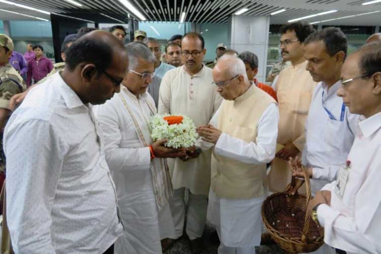 বিমানবন্দরে অটল বিহারী বাজপেয়ীর চিতাভস্মে শ্রদ্ধা জনাচ্ছেন রাজ্যপাল কেশরীনাথ ত্রিপাঠী। —নিজস্ব চিত্র