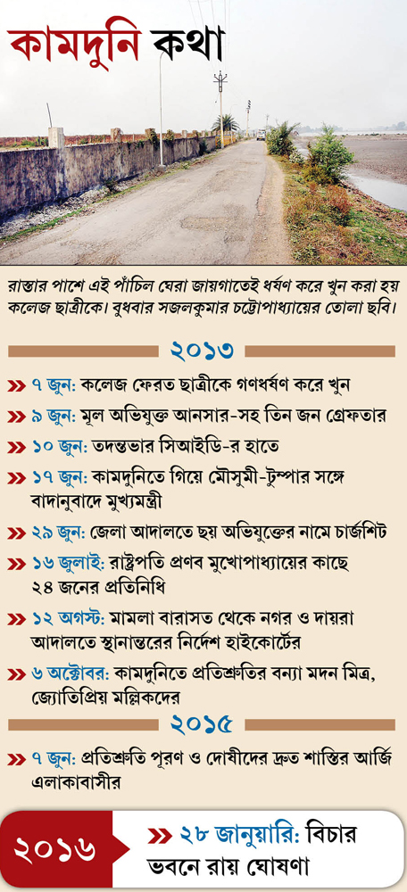 আড়াই বছর আগে, ২০১৩ সালের ৭ জুন যে নৃশংসতা দেখে শিউরে উঠেছিল গোটা কামদুনি, গোটা রাজ্য— সেই ভয় বোধহয় কাটার নয়। সে দিন টানা বৃষ্টিতে অন্ধকার নেমেছিল বিকেলেই। এ দিনের মতোই ডিরোজিও কলেজের দ্বিতীয় বর্ষের এক ছাত্রী পরীক্ষা সেরে বাস থেকে নেমেছিলেন। নিজের বাড়ির এলাকাতেও যে তিনি নিরাপদ নন, ভাবতে পারেননি। ছাতা মাথায় হেঁটে বাড়ি ফেরার পথে টেনেছিঁচড়ে পাঁচিলঘেরা জায়গাটিতে টেনে নিয়ে গণধর্ষণ করা হয়েছিল তাঁকে। অনেক রাতে ৫০০ মিটার দূরে তরুণীর ব্যাগ আর ছিন্নভিন্ন দেহ মেলে। তখন থেকেই আতঙ্কের প্রহর গোনে কামদুনি।