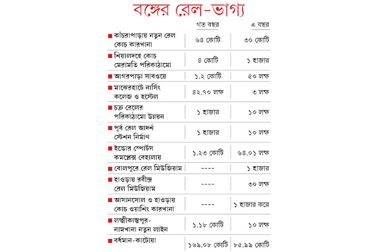 গত কয়েক বছর ধরে অর্থের জোগান কম থাকায় নতুন নির্মাণের পরিবর্তে যাত্রী পরিষেবা বৃদ্ধিতে জোর দিয়েছে রেল মন্ত্রক। সে ক্ষেত্রেও পশ্চিমবঙ্গের জন্য সুখবর নেই। গোটা মালদহ ডিভিশনের ছ’টি প্ল্যাটফর্ম উঁচু করা, প্ল্যাটফর্ম শেড, যাত্রী ওভারব্রিজ, নতুন স্টেশন ভবন, পানীয় জল ও বেঞ্চ পাতার খাতে বরাদ্দ হয়েছে সাকুল্যে এক লক্ষ টাকা।