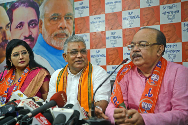 বিজেপিতে যোগ দেওয়ার পর কলকাতার অফিসে দিলীপ ঘোষের সঙ্গে শোভন চট্টোপাধ্যায় এভং বৈশাখী বন্দ্যোপাধ্যায়।—ফাইল চিত্র।
