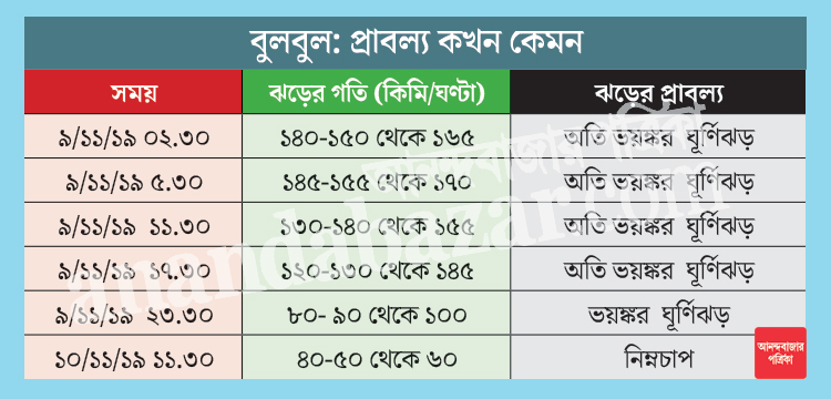 আলিপুর আবহাওয়া দফতর সূত্রে খবর, শনিবার রাত ৮টা থেকে ১২টার মধ্যে এ রাজ্যের সাগর দ্বীপ ও বাংলাদেশের খেপুপাড়ার মধ্যবর্তী এলাকায় আছড়ে পড়বে বুলবুল। এই মুহূর্তে ঘূর্ণিঝড়টি বাংলাদেশের খেপুপাড়া থেকে প্রায় ৩০০ কিলোমিটার দূরে রয়েছে। ওড়িশার পারাদ্বীপ থেকে প্রায় ১১৫ কিলোমিটার দূরে অবস্থান করছে এটি। অন্য দিকে, দিঘা থেকে প্রায় ১২০ কিলোমিটার দূরে রয়েছে বুলবুল।