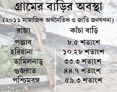 গ্রামীণ বাড়ির অবস্থাও তথৈবচ। ৯ লক্ষ ৭৯ হাজার বাড়ির মধ্যে সাড়ে চার লক্ষ পাকা বাড়ি। মাটির দেওয়াল রয়েছে ২ লক্ষ ১৭ হাজার বাড়ির। বাঁশ, ঘাস-খড়ের দেওয়াল আরও ২ লক্ষ বাড়ির। ছাদ বলতে হাত-তৈরি টালি, নইলে টিন।