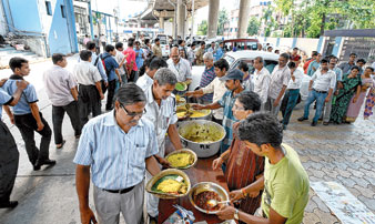 খিচুড়ি খাওয়ার লাইন। বুধবার, নবান্নে।—নিজস্ব চিত্র।