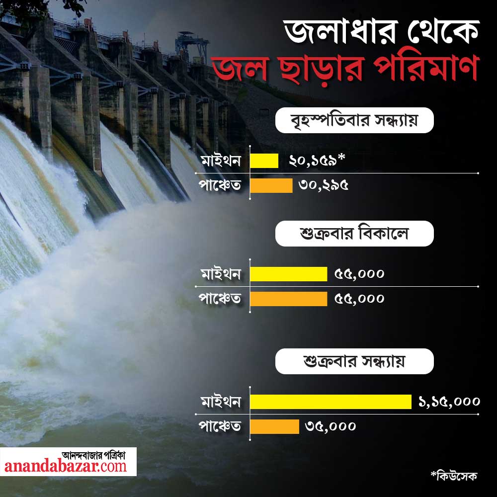 শুক্রবার সকালেই মাইথন জলাধার থেকে ৮০ হাজার কিউসেক এবং পাঞ্চেত থেকে ৫৫ হাজার কিউসেক জল ছাড়া হয়েছে। অন্য দিকে, দুর্গাপুর ব্যারাজ থেকে দেড় লক্ষে কিউসেকেরও বেশি জল ছাড়া হয়েছে। ফলে নতুন করে হাওড়া, হুগলির বিস্তীর্ণ এলাকায় বন্যা পরিস্থিতি তৈরি হয়েছে। হাওড়ার উদয়নারায়ণপুরে বন্যা পরিস্থিতি নিয়ে প্রশাসনিক বৈঠক হয়। নদীবাঁধ পরিদর্শন করেন উদয়নারায়ণপুরের বিধায়ক সমীর পাঁজা। গত জুলাই-অগস্টে ভয়াবহ বন্যার ফলে নদীবাঁধ-সহ বেশির ভাগ জায়গার ব্যাপক ক্ষতি হয়। উদয়নারায়ণপুরের পাশাপাশি হুগলির আরামবাগ, খানাকুলের বিস্তীর্ণ এলাকাও প্লাবিত হওয়ার আশঙ্কা দেখা দিয়েছে।