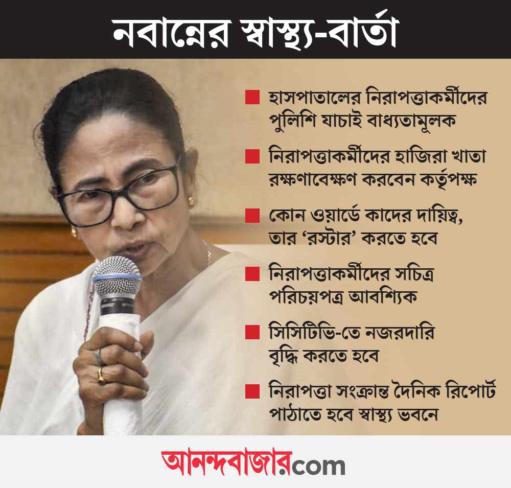 বৈঠকে জেলা প্রশাসনগুলির উদ্দেশে মুখ্যসচিব ছ’টি নির্দেশিকা দিয়েছেন। যার মধ্যে, নিরাপত্তাকর্মীদের পুলিশ যাচাই, হাজিরা খাতা সঠিক ভাবে রক্ষণাবেক্ষণ করা, কাজের রস্টার তৈরি করা, স্বাস্থ্য ভবনে দৈনিক রিপোর্ট পাঠানোর বিষয় রয়েছে। স্বাস্থ্য সংক্রান্ত বৈঠকে পুলিশকর্তাদের ডেকে নেওয়াকে ‘তাৎপর্যপূর্ণ’ বলে মনে করছেন প্রশাসনিক মহলের অনেকে। কারণ, পর পর ঘটনাগুলি যতটা না স্বাস্থ্যসংক্রান্ত, তার চেয়েও বেশি নিরাপত্তা এবং আইন-শৃঙ্খলার সঙ্গে জড়িত।