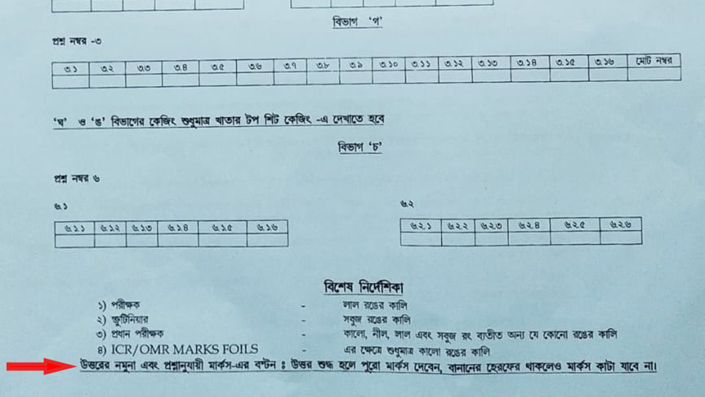 গত বছর পর্যন্ত উত্তরপত্রের প্রথম পাতায় প্রশ্নের সংখ্যার পাশে ‘কেজিং’ বা চৌকো খোপ করা থাকত। তাতে প্রাপ্ত নম্বর লিখতে হত পরীক্ষককে। এক ও দু’নম্বরের যত প্রশ্ন থাকত, তত খোপ থাকত না। পরীক্ষকদের নির্দেশ দেওয়া হয়েছে, খোপ তৈরি করে আলাদা নম্বর দিতে হবে। পরীক্ষকদের খোপ কাটতে হবে পেনসিল দিয়ে। যা একটা বাড়তি বোঝা। পরীক্ষকদের মতে, খোপ কাটতে হলে খাতা দেখার সময় আরও বেড়ে যাবে।
