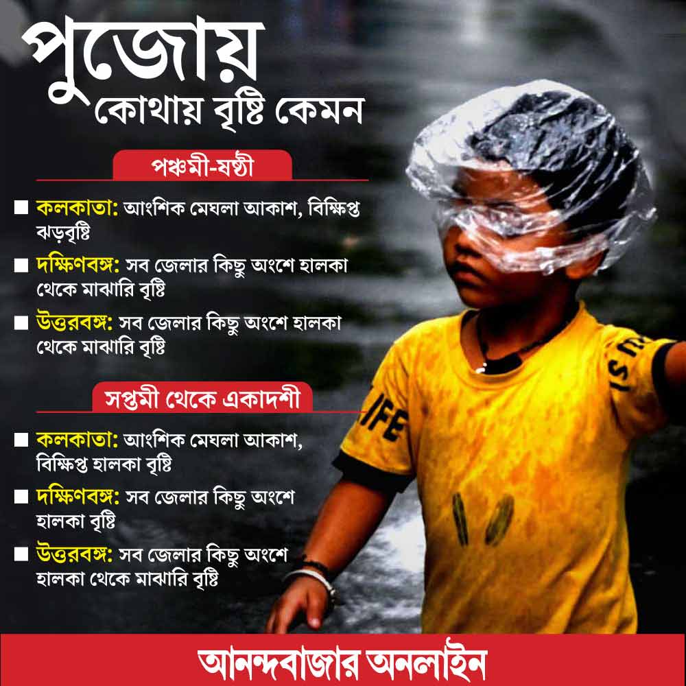পুজোর আগে আবার ভ্রুকুটি নিম্নচাপের। তার প্রভাবে আগামী বুধবার, ষষ্ঠী পর্যন্ত সারা রাজ্যে বৃষ্টির পূর্বাভাস রয়েছে। প্রশ্ন এখন একটাই, পুজোতেও কি চলবে বৃষ্টি? আলিপুর আবহাওয়া দফতরের বিশেষ বুলেটিনে জানানো হয়েছে, একাদশী পর্যন্ত কলকাতা-সহ গোটা রাজ্যের প্রায় সব জেলায় কমবেশি বৃষ্টির সম্ভাবনা রয়েছে। স্বস্তির বিষয়, কোথাও ভারী বৃষ্টির সম্ভাবনা নেই। আর জেলার সব জায়গায় বৃষ্টি হবে না। বিক্ষিপ্ত ভাবে কিছু কিছু অংশে ১৩ অক্টোবর পর্যন্ত বৃষ্টি চলবে।