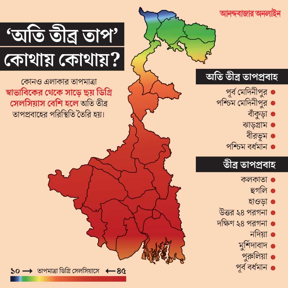 এই ছ’টি জেলা হল পূর্ব মেদিনীপুর, পশ্চিম মেদিনীপুর, বাঁকুড়া, ঝাড়গ্রাম, বীরভূম এবং পশ্চিম বর্ধমান। এ ছাড়া কলকাতা, হুগলি, হাওড়া, দুই ২৪ পরগনা, নদিয়া, মুর্শিদাবাদ, পুরুলিয়া এবং পূর্ব বর্ধমানেও তীব্র তাপপ্রবাহের সতর্কতা জারি করা হয়েছে।