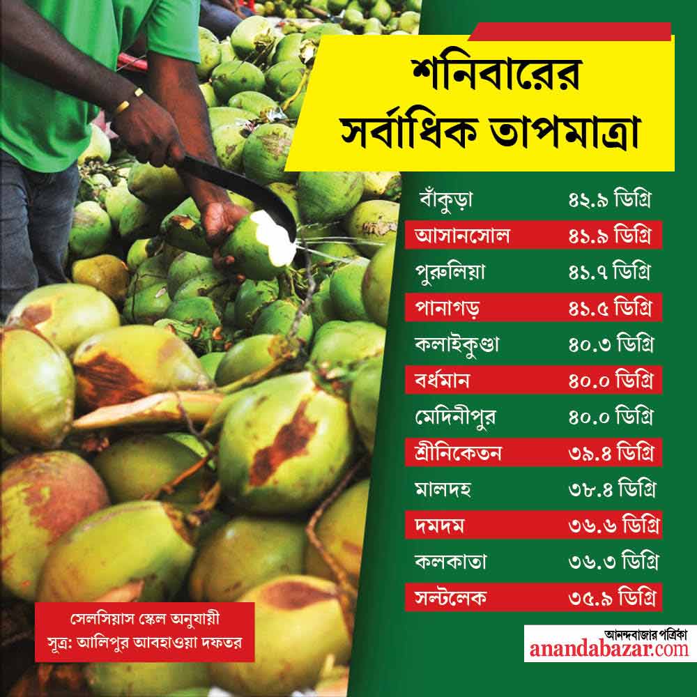 শনিবার রাজ্যে সব চেয়ে বেশি তাপমাত্রা ছিল বাঁকুড়ায়, ৪২.৩ ডিগ্রি সেলসিয়াস। এ ছাড়া পুরুলিয়া, আসানসোল-সহ রাজ্যের সাত জেলার তাপমাত্রা ছিল চল্লিশের ঘরে। আবহাওয়া দফতরের পূর্বাভাস অনুযায়ী রবিবারও দক্ষিণবঙ্গের পুরুলিয়া, ঝাড়গ্রাম, বাঁকুড়া, পশ্চিম বর্ধমানে তাপপ্রবাহের সম্ভাবনা রয়েছে।